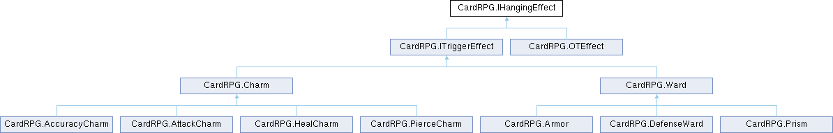 Implemented in CardRPG.AccuracyCharm, CardRPG.Armor, CardRPG.AttackCharm, CardRPG.Charm, CardRPG.DefenseWard, CardRPG.HealCharm, CardRPG.OTEffect, CardRPG.PierceCharm, CardRPG.Prism, and CardRPG.Ward.